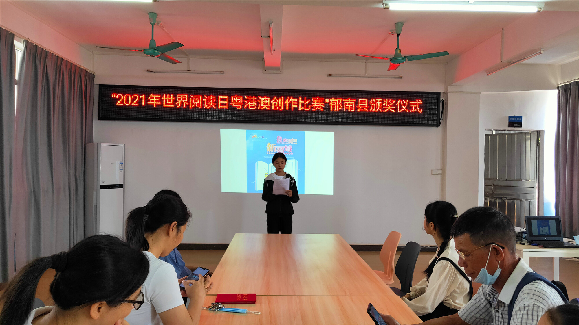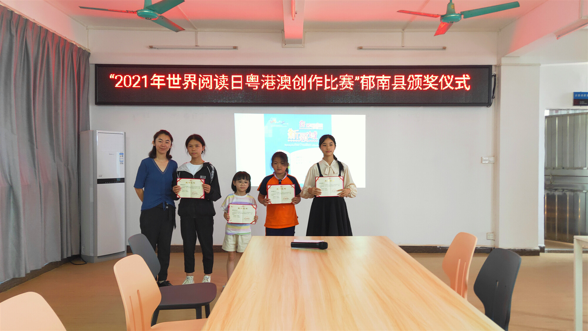 為鼓勵(lì)兒童及青少年拓展閱讀領(lǐng)域,深化閱讀層次,用閱讀開啟知識大門,粵港澳三地聯(lián)合了舉辦以“探索閱讀新領(lǐng)域”為主題的2021年世界閱讀日粵港澳創(chuàng)作比賽。郁南縣圖書館總分館通過微信公眾號,以線上活動(dòng)形式面向全縣中小學(xué)開展“2021世界閱讀日粵港澳創(chuàng)作比賽”作品征集活動(dòng),得到縣內(nèi)各中小學(xué)校老師、家長、學(xué)生們的積極響應(yīng),踴躍參與。本次活動(dòng)廣東賽區(qū)共收到創(chuàng)作稿件9.8萬份,郁南縣圖書館選送作品38份,其中4份作品獲省級榮譽(yù),分別為初中組一等獎(jiǎng)一名、高小組三等獎(jiǎng)一名、初小組優(yōu)秀獎(jiǎng)兩名,由廣東省文化和旅游廳頒發(fā)獎(jiǎng)狀。2021年4月24日上午,郁南縣圖書館在四樓舉行了頒獎(jiǎng)儀式。頒獎(jiǎng)儀式上,獲獎(jiǎng)?wù)呦騾⒓踊顒?dòng)的讀者分享了獲獎(jiǎng)心得。