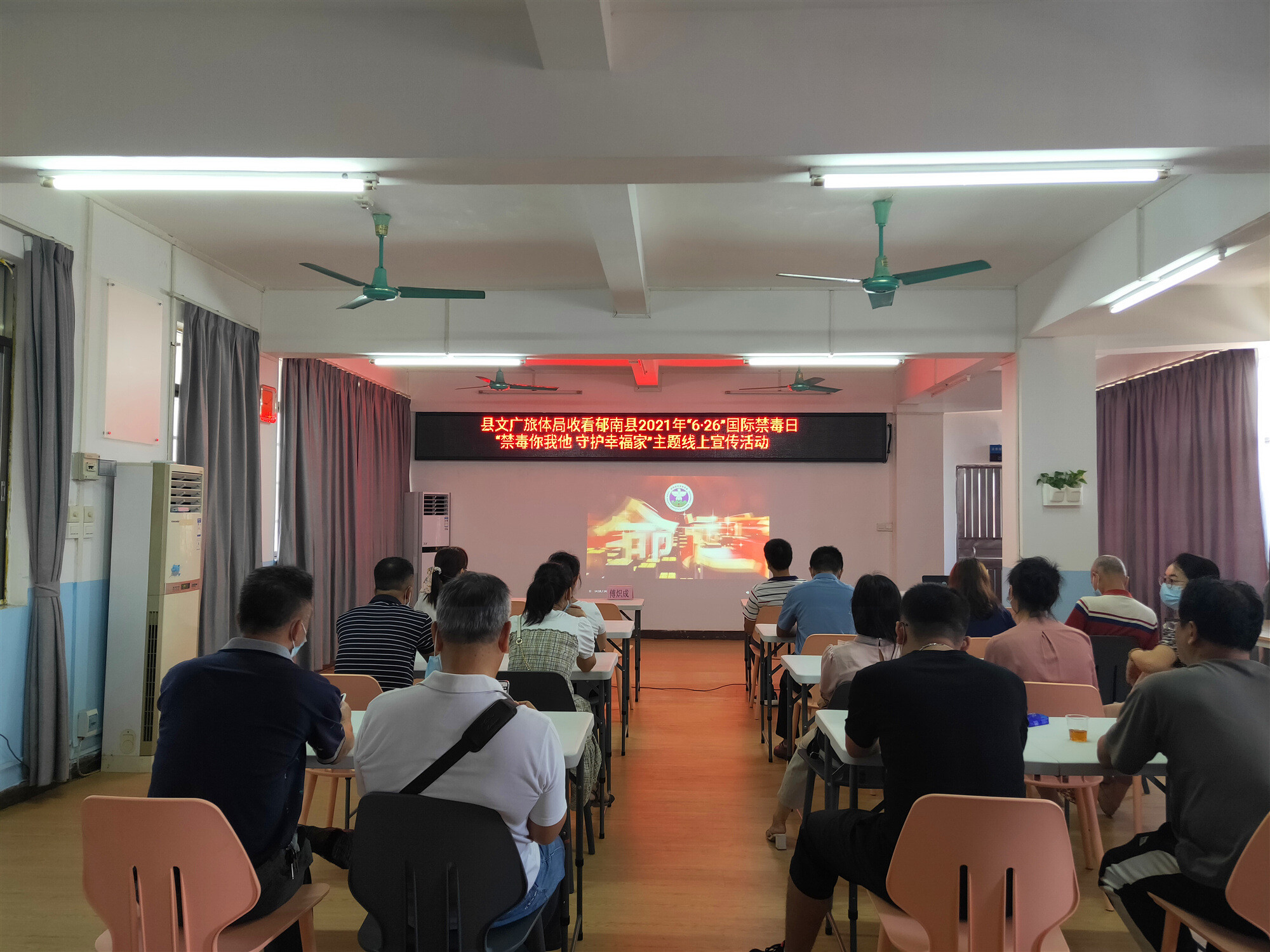 為進一步加大禁毒宣傳力度,支持、參與禁毒工作,掀起禁毒宣傳熱潮,6月25日上午,郁南縣文廣旅體局組織干部職工在縣圖書館四樓視聽室觀看郁南縣2021年“6·26”國際禁毒日“禁毒你我他 守護幸福家”主題線上宣傳活動。郁南縣文廣旅體局黨組書記、局長傅熾成,分管禁毒、行政執(zhí)法等工作的副局長張世佳同志參加了活動。