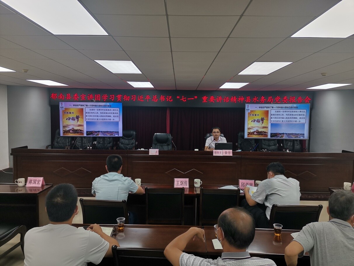 為深入學(xué)習(xí)貫徹習(xí)近平總書記在慶祝中國共產(chǎn)黨成立100周年大會上的重要講話精神,推動黨史學(xué)習(xí)教育走深走實(shí),8月13日下午,縣水務(wù)局召開學(xué)習(xí)貫徹習(xí)近平總書記在慶祝中國共產(chǎn)黨成立100周年大會上重要講話精神專題宣講會。會議邀請了黨史學(xué)習(xí)教育縣委宣講團(tuán)成員、縣實(shí)驗中學(xué)團(tuán)委書記黃宇同志作宣講,縣水務(wù)局全體在家黨員干部職工30多人參加了宣講會。