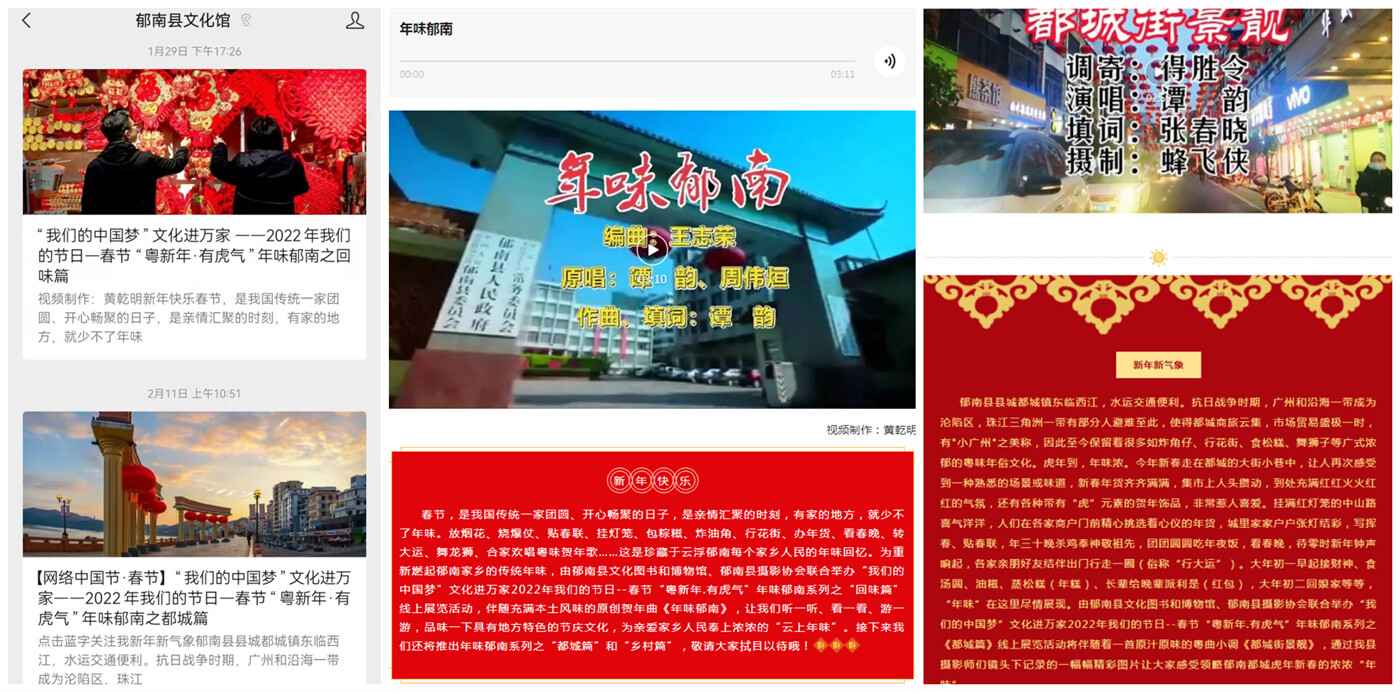 為滿足疫情防控期間廣大群眾對文化生活的需求,郁南縣文化圖書和博物館在春節(jié)期間積極推進(jìn)線上文化活動,把濃濃“年味”送給千家萬戶。其中之一,是由郁南縣文化圖書和博物館、郁南縣攝影協(xié)會聯(lián)合舉辦的“我們的中國夢”文化進(jìn)萬家2022年我們的節(jié)日--春節(jié)“粵新年.有虎氣”年味郁南系列之《回味篇》和《都城篇》線上展覽活動。該活動通過郁南縣文化館微信公眾號推出,上線以來受到各界群眾的廣泛關(guān)注和點贊,閱讀量累計近1800人次。