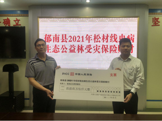松材線蟲(chóng)病,是松樹(shù)的一種毀滅性的病害,號(hào)稱(chēng)“松樹(shù)癌癥”,自2021年2月起,郁南縣公益生態(tài)林受到松材線蟲(chóng)病的侵害,出現(xiàn)大面積的松樹(shù)死亡。人保財(cái)險(xiǎn)郁南支公司接到相關(guān)報(bào)案后,迅速啟動(dòng)應(yīng)急預(yù)案,聯(lián)合縣自然資源局及第三方公估公司人員,對(duì)15個(gè)鄉(xiāng)鎮(zhèn)受災(zāi)地區(qū)開(kāi)展理賠查勘定損和賠付工作,于2022年4月22日現(xiàn)場(chǎng)向縣自然資源局支付賠款99.5萬(wàn)元。