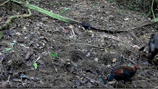 據(jù)影像所見,雄性原雞和一群雌性白鷴在同一個場地中覓食,原雞羽毛光亮鮮艷、白鷴身姿優(yōu)美。兩種鳥類時而互不打擾,各自覓食,時而陷入對峙,劍拔弩張,場景非常有趣。除此之外,紅外相機還拍攝到亞成體原雞和野豬同時出現(xiàn)。風暖鳥聲碎,日高花影重。原雞與白鷴共舞,野豬自在覓食,共同譜寫了一幅詩意盎然的山野風光,體現(xiàn)了廣東郁南同樂大山省級自然保護區(qū)多年辛勤工作的成效。