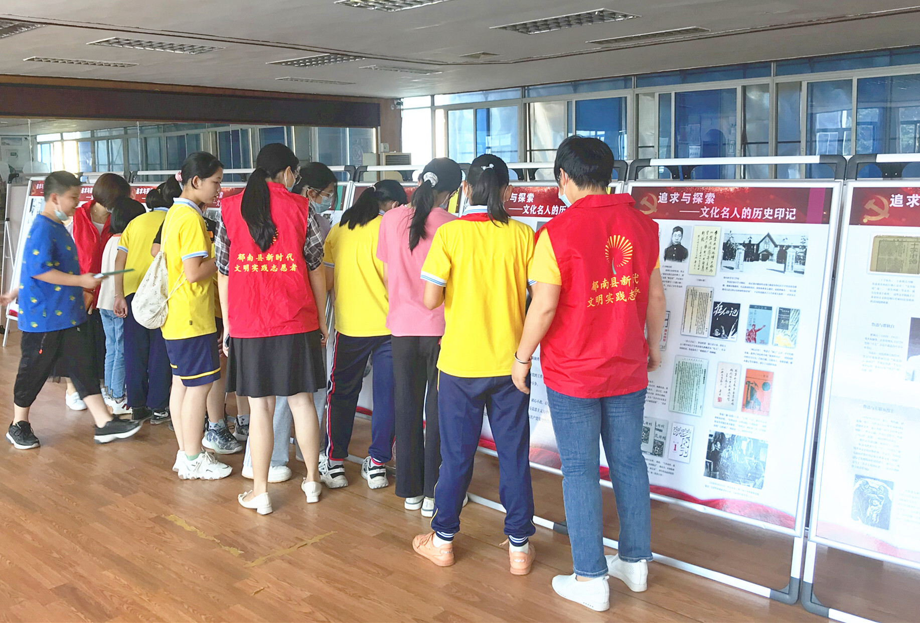 師生們在文化志愿者的引導下,饒有興致地參觀了書畫展和《追求與探索——文化名人的歷史印記》圖片展,對本土書畫藝術(shù)發(fā)展有了更深入的了解,對推動我國經(jīng)濟、文化社會發(fā)展前行的歷史文化名人有了更深刻的認識。