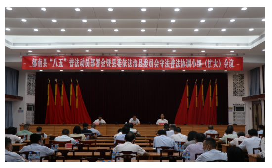 為深入學習貫徹黨的十九屆六中全會精神,貫徹落實習近平法治思想,以及中央全面依法治國、省委全面依法治省、市委全面依法治市工作會議精神,9月20日上午,郁南縣召開“八五”普法動員部署會暨縣委全面依法治縣委員會守法普法協(xié)調(diào)小組(擴大)會議??h政府副縣長、縣公安局局長王朝輝出席會議并講話。縣委全面依法治縣辦副主任、守法普法協(xié)調(diào)小組副組長、縣司法局局長賴偉強主持會議。縣委全面依法治縣委員會守法普法協(xié)調(diào)小組成員單位有關(guān)負責人;各鎮(zhèn),縣直和上級駐郁南單位分管負責同志參加會議。