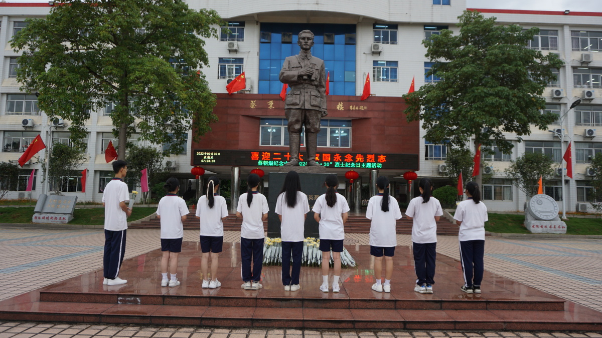 9月30日,時值全國第九個烈士紀念日。為深入開展黨史學(xué)習(xí)教育,學(xué)史明理、學(xué)史增信、學(xué)史崇德、學(xué)史力行,讓學(xué)生銘記蔡朝焜烈士事跡,培養(yǎng)學(xué)生的愛國主義情操,繼承和弘揚英烈精神。我校在學(xué)校廣場舉行了2022年烈士紀念日活動,全校師生參與了本次活動,活動由學(xué)校少先隊輔導(dǎo)員孔晴主持。