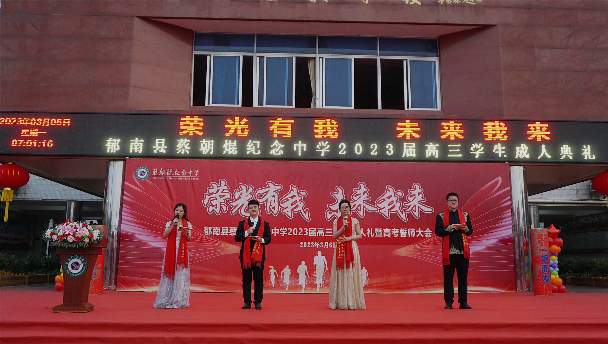 為激發(fā)學生長大成人的神圣感、使命感,喚醒同學們的成人意識和責任意識,讓每位同學真正理解自己應有的社會擔當,更有信心和激情面對高考。2023年3月6日上午,蔡朝焜紀念中學舉行了2023屆高三學生成人典禮暨高考誓師大會,以此銘記青春,向成長致禮!團縣委書記蔡玲同志、縣教育局副局長凌瑯同志、全校師生、蔡朝焜紀念中學教育集團成員學校領導以及500多位家長共同參加了本次活動?;顒佑申惌t銘老師、李岑沛老師和高三(13)班蔡豐澤同學、高三(4)班賴念思同學共同主持。