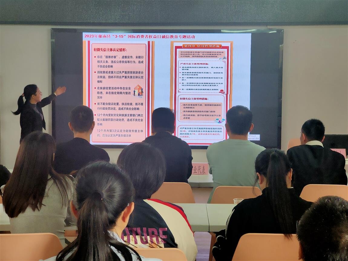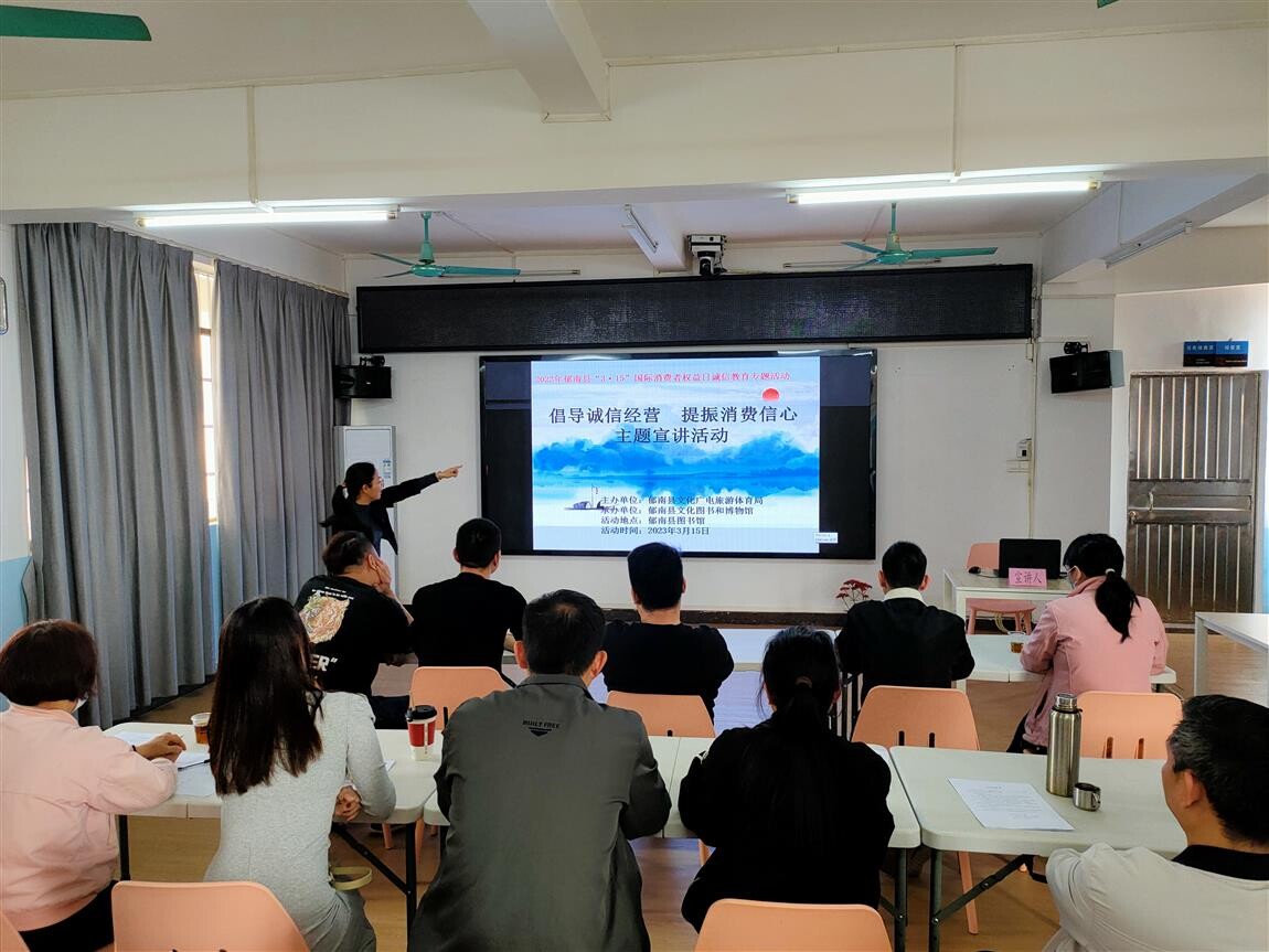 為積極營造安全放心的消費環(huán)境,更好地維護消費者合法權益,維護穩(wěn)定的社會經(jīng)濟秩序,3月15日,郁南縣文廣旅體局舉辦了2023年郁南縣“3·15”國際消費者權益日誠信教育專題活動——“倡導誠信經(jīng)營 提振消費信心”主題宣講活動,縣城轄區(qū)內(nèi)文化娛樂場所、網(wǎng)吧、旅行社、星級飯店、A級景區(qū)等文化旅游經(jīng)營單位負責人參加。