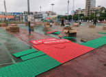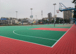 ▲體育中心籃球場(chǎng)地面塑膠鋪設(shè)工作
