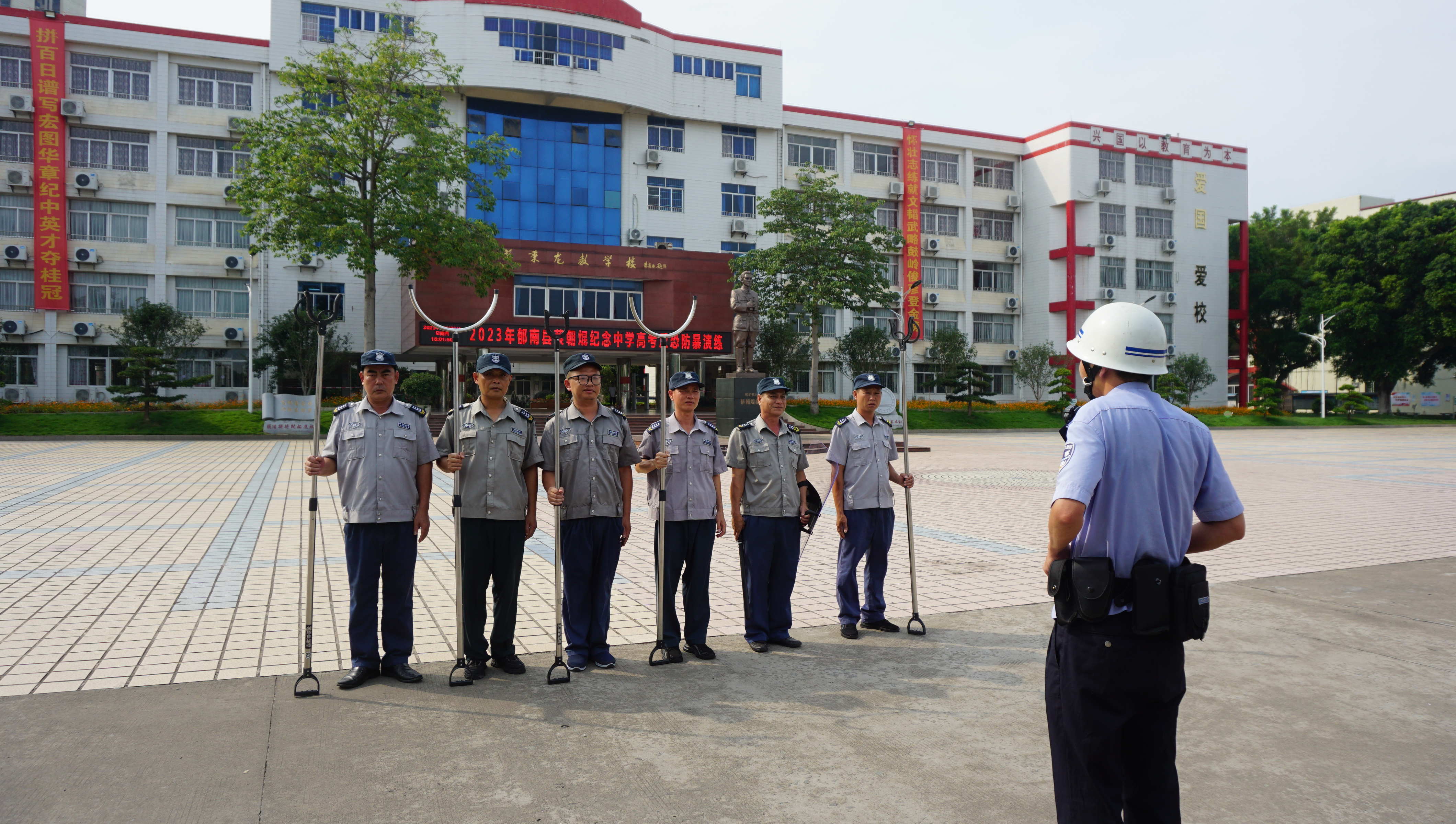 2023年高考將至,為了切實(shí)做好高考考試組織工作,確保工作萬無一失,實(shí)現(xiàn)“健康、平安、公平、誠信、暖心”高考五大目標(biāo)。6月1日下午,蔡朝焜紀(jì)念中學(xué)舉行了2023年高三考生高考進(jìn)場(chǎng)暨防恐、防暴應(yīng)急疏散演練活動(dòng)。 活動(dòng)開始前,學(xué)校成立了工作領(lǐng)導(dǎo)小組,精心策劃,認(rèn)真組織,扎實(shí)開展演練活動(dòng),確保了演練活動(dòng)順利進(jìn)行。 首先進(jìn)行的是防恐、防暴應(yīng)急疏散演練活動(dòng)。為確保演練效果,學(xué)校邀請(qǐng)了郁南縣都城鎮(zhèn)城北派出所領(lǐng)導(dǎo)、民警到場(chǎng)指導(dǎo)培訓(xùn),學(xué)校護(hù)校隊(duì)全體隊(duì)員參加了本次演練。 在演練中,城北派出所警官現(xiàn)場(chǎng)講解了校園反恐防暴技能理論,并現(xiàn)場(chǎng)演示了盾牌、警棍、鋼叉等安全防暴器材的使用方法和技巧。 現(xiàn)場(chǎng)模擬訓(xùn)練。由派出所警官扮演手持兇器企圖闖入校園的“歹徒”,一名護(hù)校隊(duì)隊(duì)員迅速報(bào)警,其余隊(duì)員使用盾牌、警棍、鋼叉等器材阻止“歹徒”進(jìn)入校園。接到報(bào)警后,城北派出所警官迅速到場(chǎng),并果斷、堅(jiān)決、迅速地將“歹徒”控制住。 我校按照2023年普通高考模擬演練工作要求,進(jìn)一步規(guī)范考場(chǎng)管理,把好考生入口關(guān),首次在考點(diǎn)使用“智能安檢門”設(shè)備,規(guī)范人員入場(chǎng)安檢工作,從源頭杜絕電子設(shè)備進(jìn)入考點(diǎn)考場(chǎng)。 演練中,考生均在“考點(diǎn)”入口處先接受人工手持金屬探測(cè)儀安檢,無異常情況后進(jìn)入“智能安檢門”,無報(bào)警聲響方可進(jìn)入考點(diǎn);若出現(xiàn)異常報(bào)警則再次接受人工手持金屬探測(cè)儀安檢并再次通過安檢門,無異常報(bào)警,且無其他違禁物品方可進(jìn)入“考場(chǎng)”參加考試。 本次演練活動(dòng),不僅進(jìn)增強(qiáng)了學(xué)校安保人員的反恐意識(shí)和處置突發(fā)事件的能力,提高了安保人員的應(yīng)急處置技巧,還進(jìn)一步增強(qiáng)了學(xué)生誠信參考意識(shí),能有效幫助師生熟悉安檢流程和要求,為確保2023年高考考生人身安全、高考安全平穩(wěn)順利進(jìn)行奠定了堅(jiān)實(shí)基礎(chǔ)。