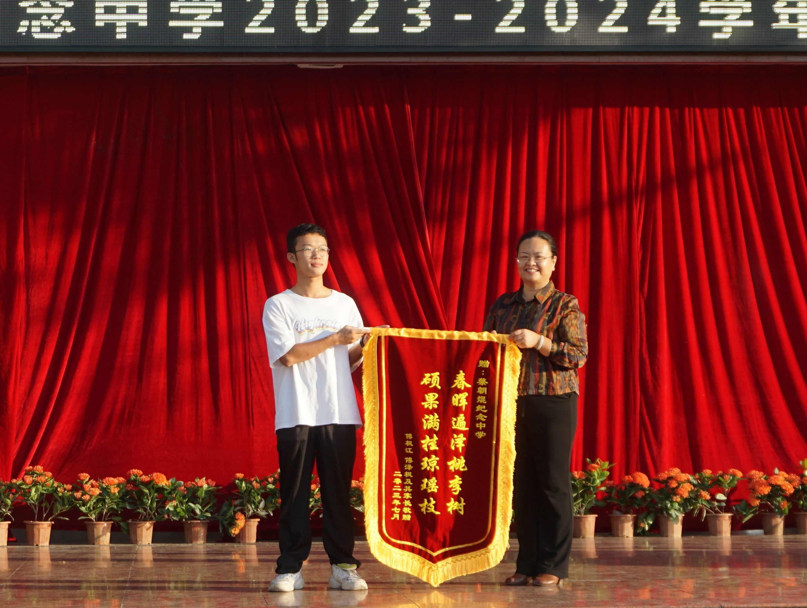 2023屆高三優(yōu)秀畢業(yè)生傅澤楓代表家長向?qū)W校贈送錦旗,感謝學(xué)校的教育培養(yǎng),他代表家長對學(xué)校的辛勤培育,對老師的細心教導(dǎo)表示衷心的感謝;也希望全體同學(xué)能心懷夢想,勇毅前行。
