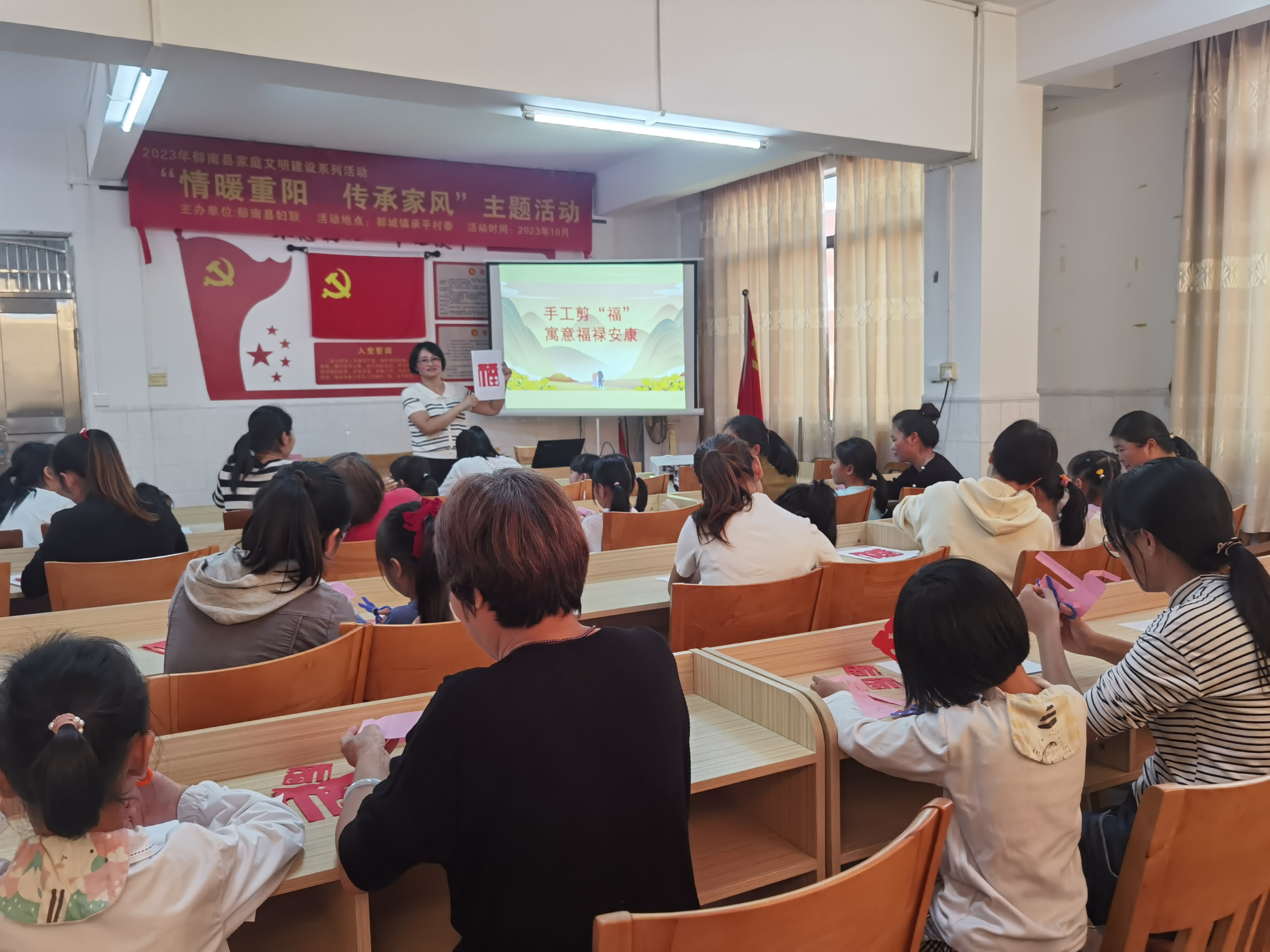 首先,婦聯(lián)工作人員以講故事的形式向群眾介紹了重陽節(jié)的登高遠(yuǎn)眺、觀賞菊花、遍插茱萸、吃重陽糕、飲菊花酒等習(xí)俗。接著,通過從中國傳統(tǒng)孝道文化、孝親敬老從我做起兩個方面知識講解,引導(dǎo)青少年學(xué)習(xí)孝道文化,學(xué)會孝敬父母、尊敬長輩,學(xué)會感恩。隨后,組織前來參加活動的群眾開展手工剪紙活動,把祝愿長輩們福祿安康的期盼都融入到了手中的一刀一剪中。一張張紅紙變成了一個個精美的“?!弊肿髌罚粗约河靡话鸭舻丁⒁浑p巧手制作出的作品,小朋友們由衷領(lǐng)略到尊老愛老的開心快樂。