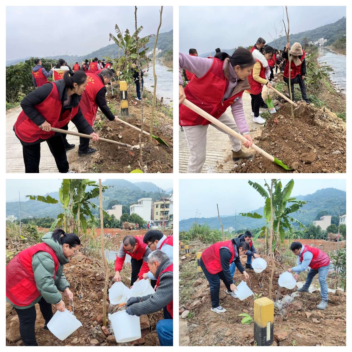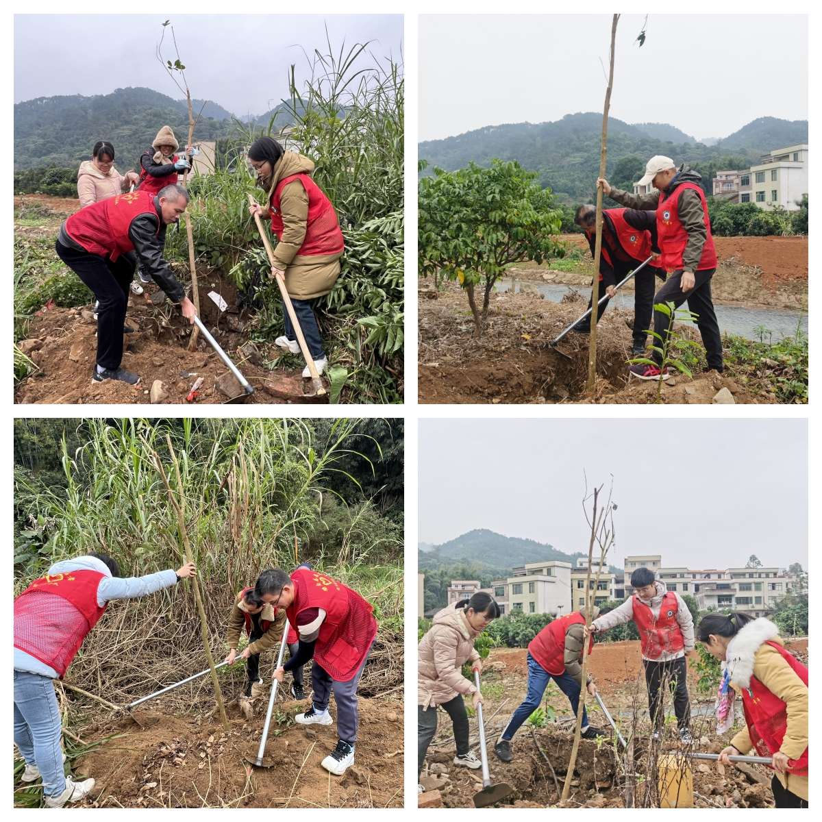 盡管冷空氣侵襲,寒風(fēng)習(xí)習(xí),但在植樹(shù)現(xiàn)場(chǎng)一片熱火朝天的景象,在學(xué)校黨總支書(shū)記彭燕飛的帶動(dòng)下,身穿紅馬甲的黨員干部們干勁十足,充分發(fā)揮不怕臟、不怕累的黨員志愿服務(wù)精神。揮鍬鏟土、扶樹(shù)填坑、壓實(shí)回填、提水澆灌,三人成組、五人成團(tuán),分工協(xié)作、各司其職,植樹(shù)的每一道工序都一絲不茍,確保種一株活一株、種一片活一片。