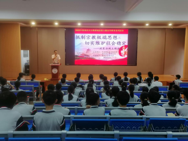 為進(jìn)一步提高師生樹立正確的國家觀、民族觀、宗教觀,積極營造校園反宗教極端思想宣傳教育氛圍,4月23日下午,縣委統(tǒng)戰(zhàn)部、縣民族宗教事務(wù)局聯(lián)合縣實(shí)驗(yàn)中學(xué)開展反宗教極端思想進(jìn)校園活動(dòng)。